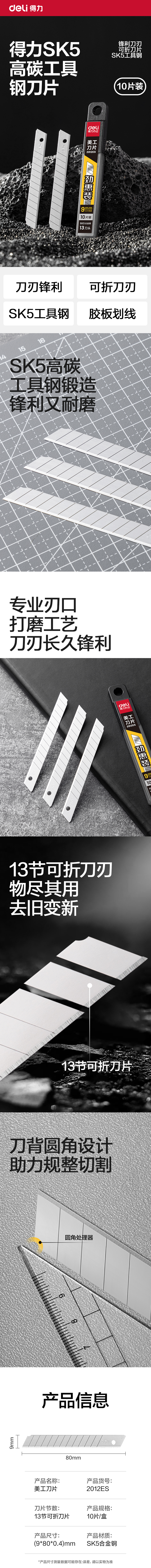 商品标题:得力2012ES美工刀片9mm60°SK5(银色)(盒)