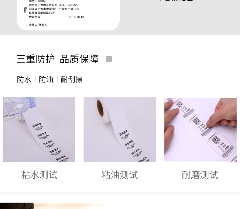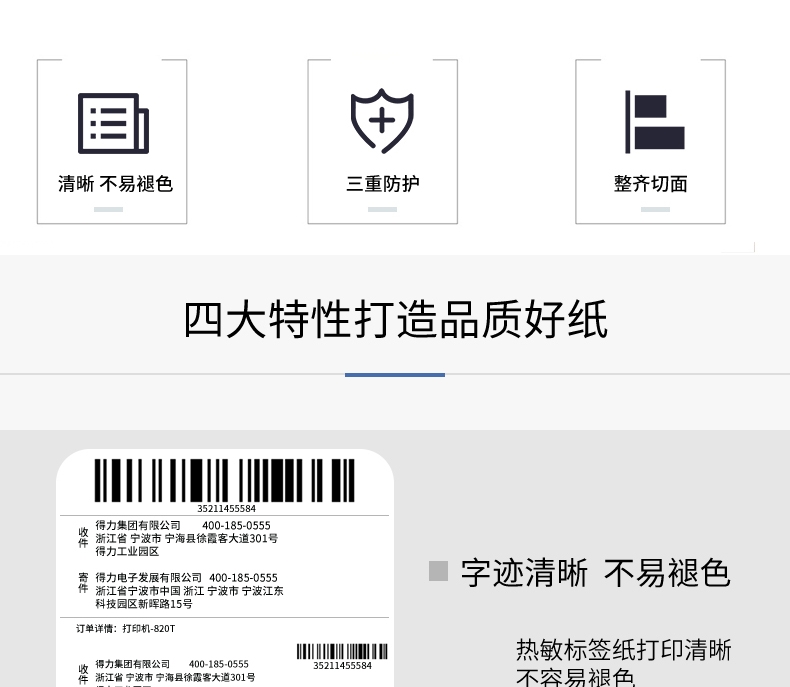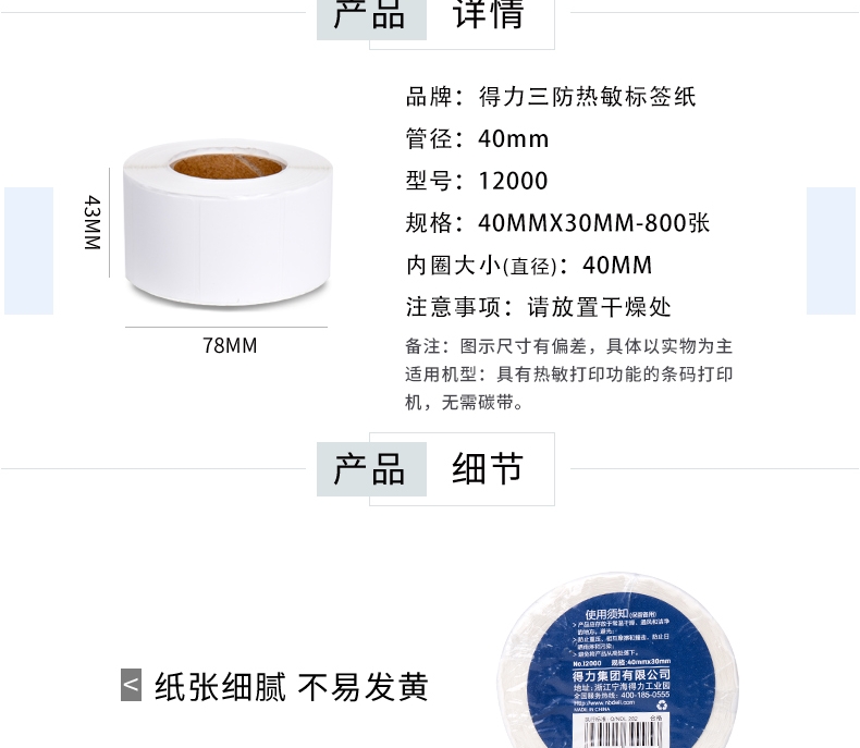 商品标题:得力12000三防热敏标签纸(40*30mm-800张)(白)(4卷/筒)