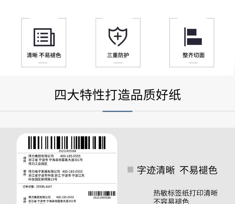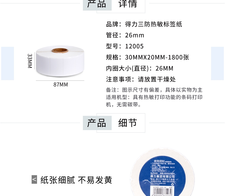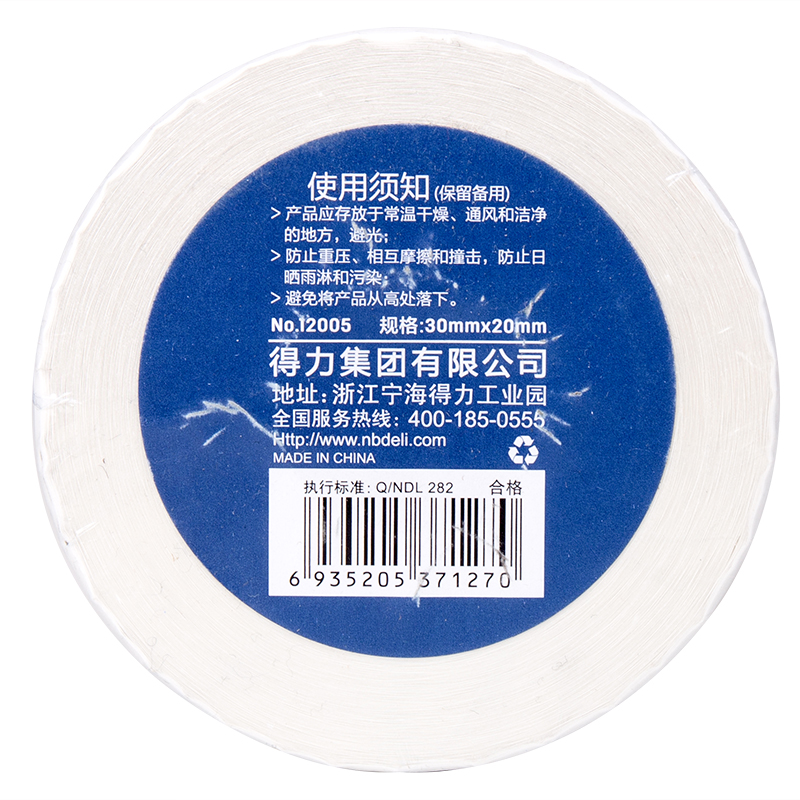 商品标题:得力12005三防热敏标签纸(30*20mm-1800张)(白)(4卷/筒)