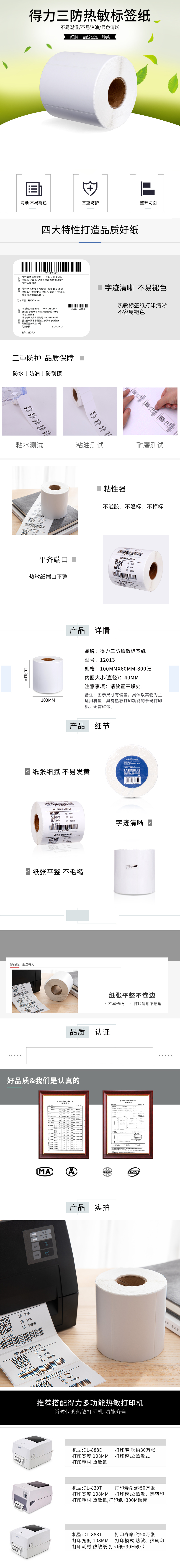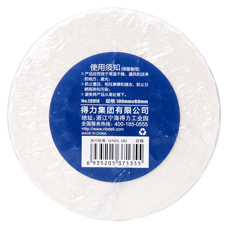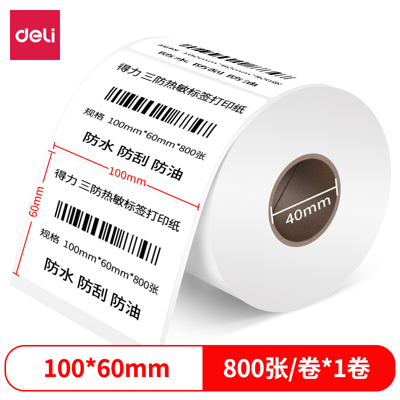 得力12013三防热敏标签纸 1卷/筒 100*60mm-800张(单位:筒)白
