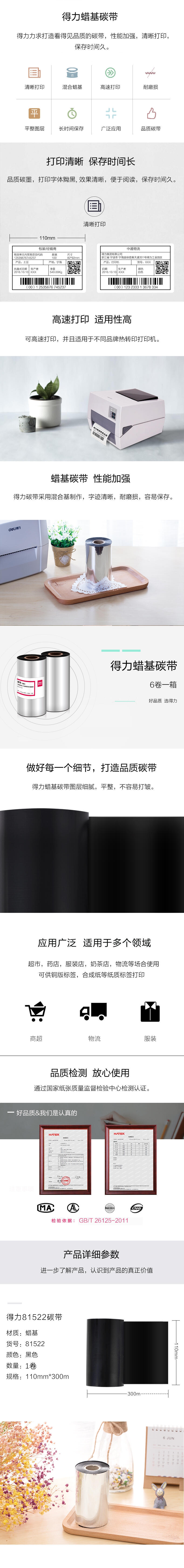 商品标题:得力81522普通蜡基碳带(黑)(卷)(110mm*300m)