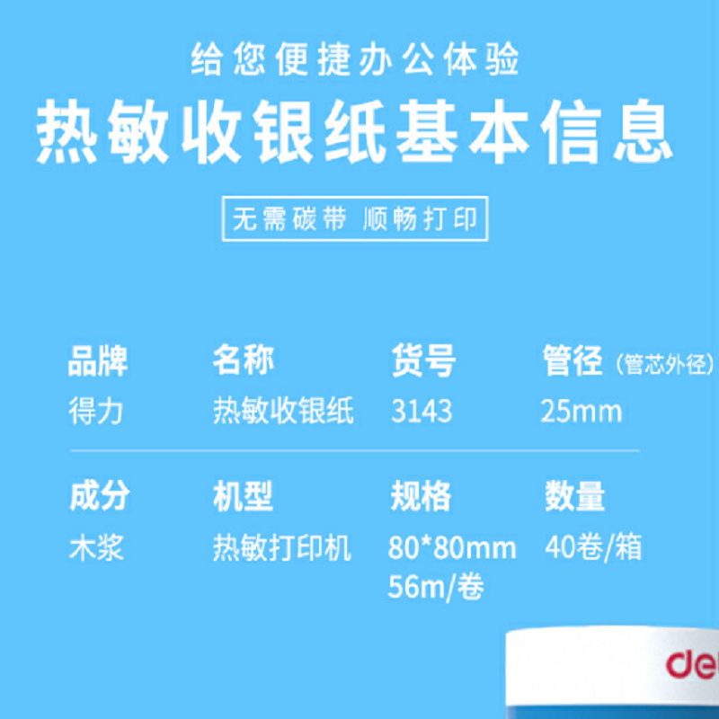商品标题:得力 3143 热敏收银纸 80mm*80mm*56m(单位:2卷/筒)