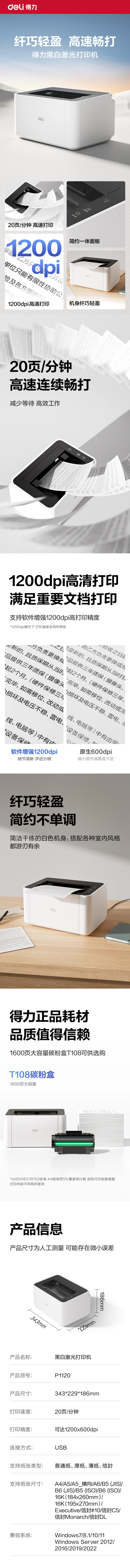 商品标题:得力黑白激光打印机P1120(白)(台)