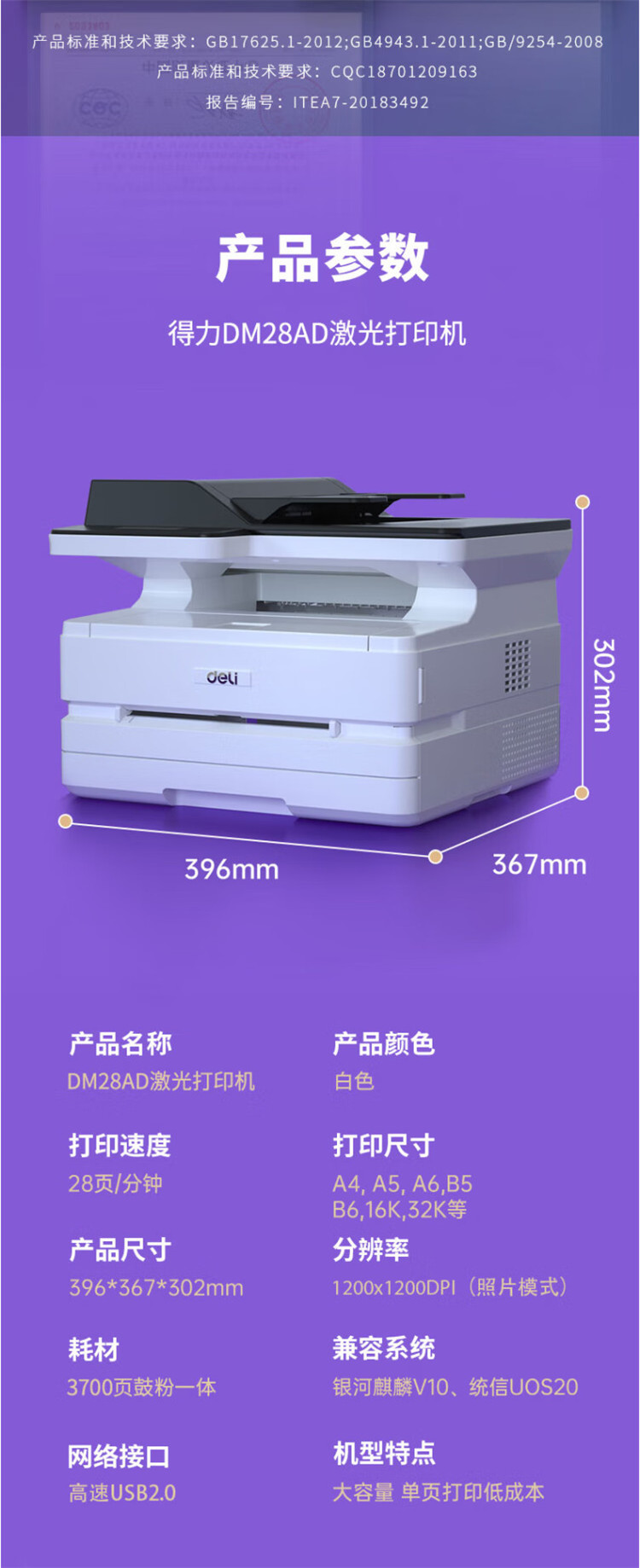 商品标题:得力 DM28AD 激光一体机(白色)(台)