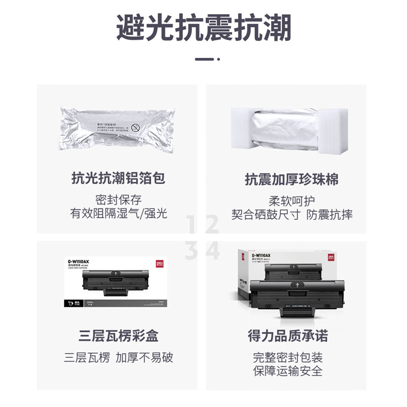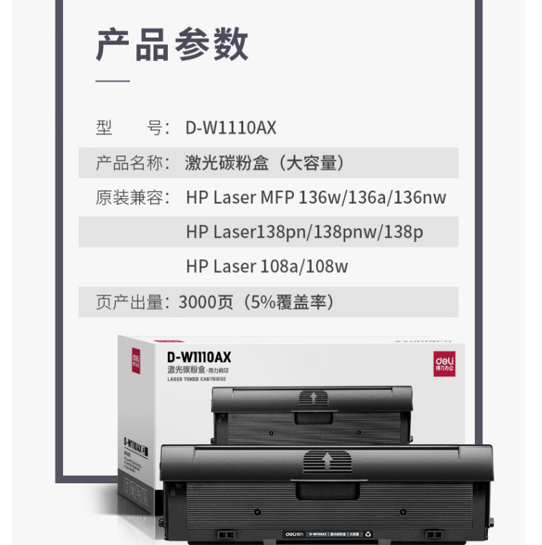 商品标题:得力(deli) D-W1110AX 一体式硒鼓 大容量单只装(适用惠普108a 138pn 136nw等机型)黑色 打印页数:3000页 (单位:支)