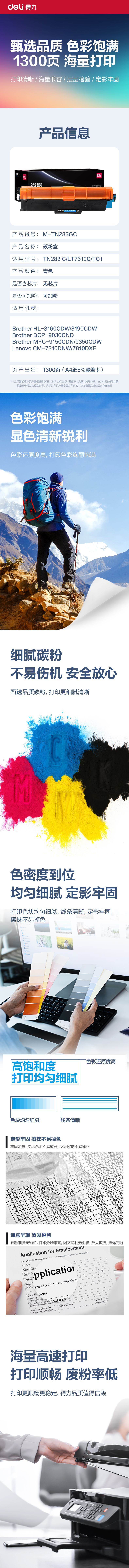 得力(deli)尚影系列兼容M-TN283GC粉盒(鼓粉分离)青色单支装(适用兄弟HL-3160CDW/3190CDW/DCP-9030CND/MFC-9150CDN/9350CDW)打印页数:1300(单位:支)