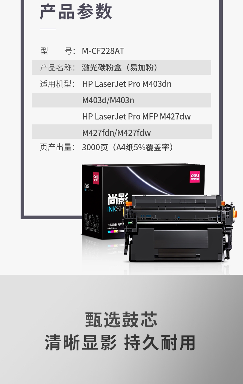 得力(deli)尚影系列兼容M-CF228AT硒鼓(鼓粉一体)黑色单支装(适用惠普LaserJet Pro M403dn/M403d/M403n/MFP M427dw/M427fdn/M427fdw系列)打印页数:3000(单位:支)