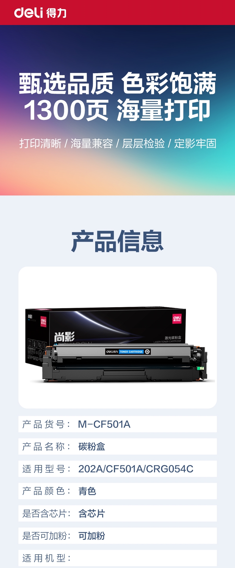 商品标题:得力(deli)尚影系列兼容M-CF501A硒鼓(鼓粉一体)青色单支装(适用惠普Color LaserJet Pro M254dn/M254dw/M254nw/MFP M280nw/MFP M281cdw/MFP M281fdn/MFP M281fdw)打印页数:1300(单位:支)