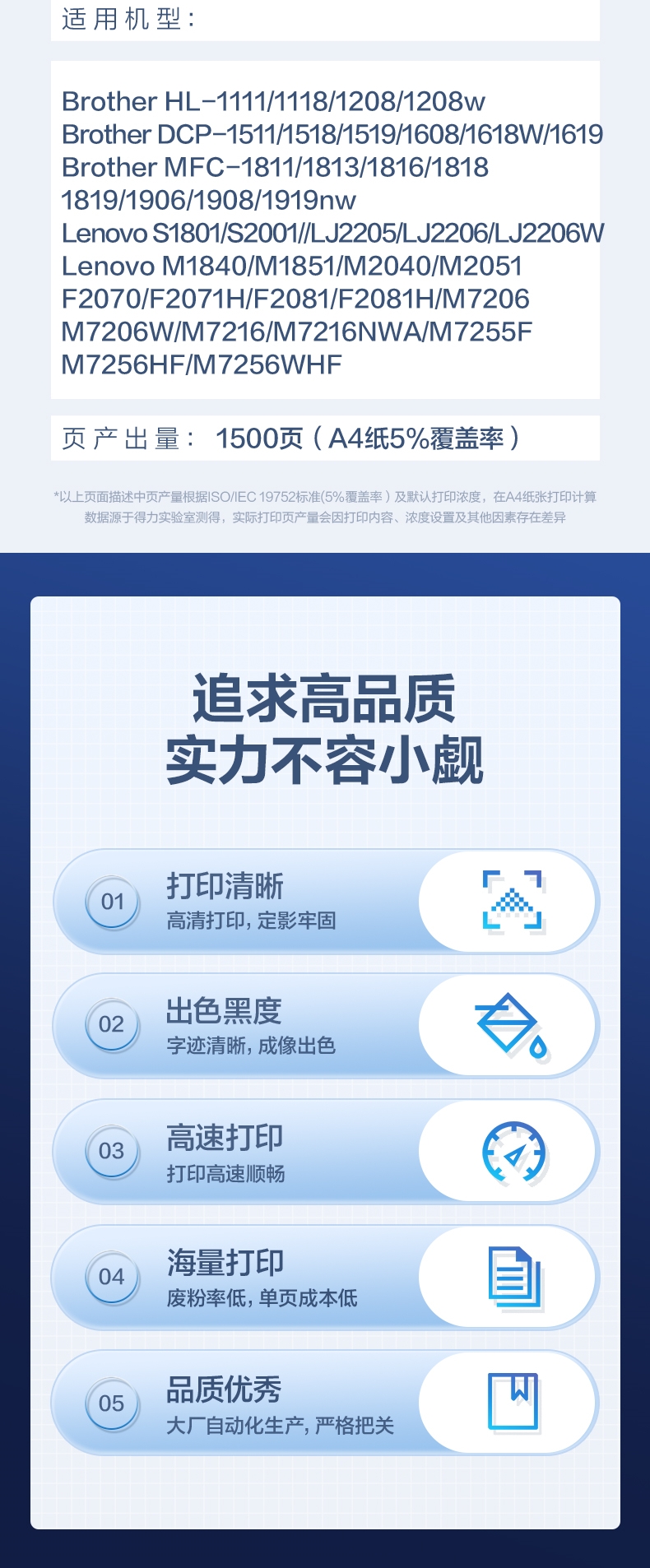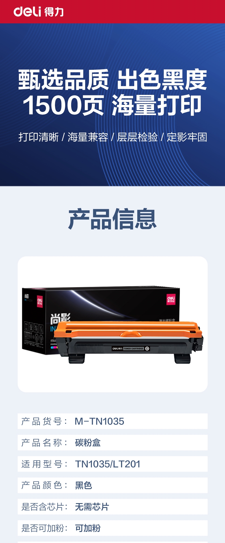 得力(deli)尚影系列兼容M-TN1035粉盒(鼓粉分离)黑色单支装(适用兄弟HL-1111/1118/1208/1208w/DCP-1511/1518/1519/1608/1618W/1619)打印页数:1500(单位:支)