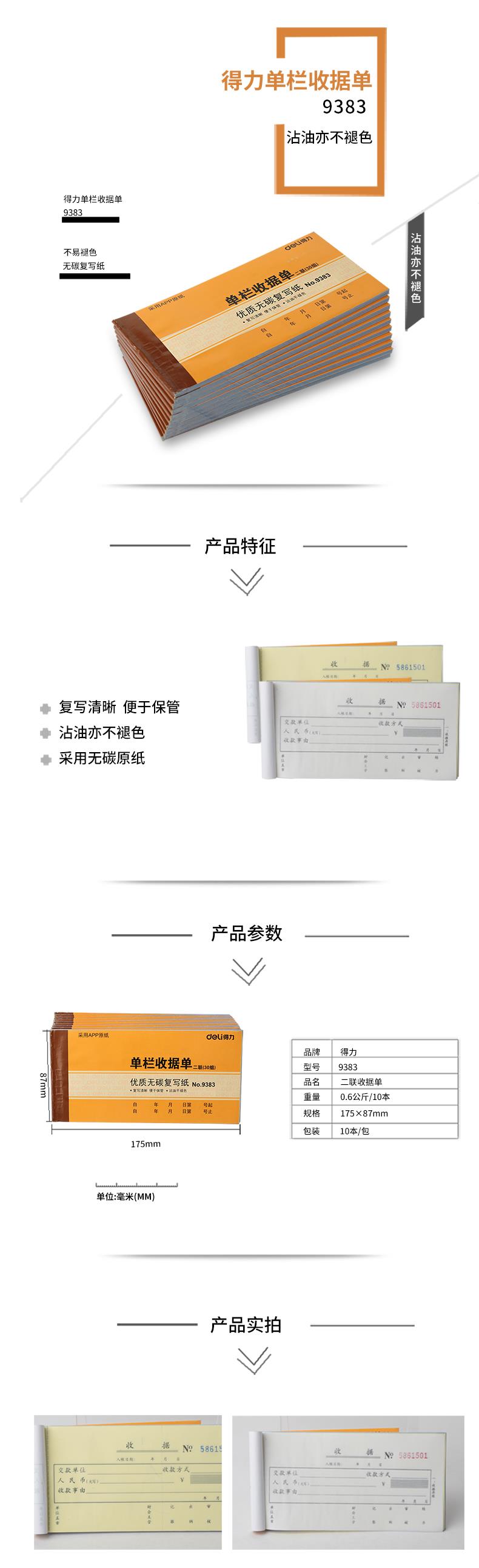 商品标题:得力 9383 二联单栏收据 175x87mm (单位:本) 黄