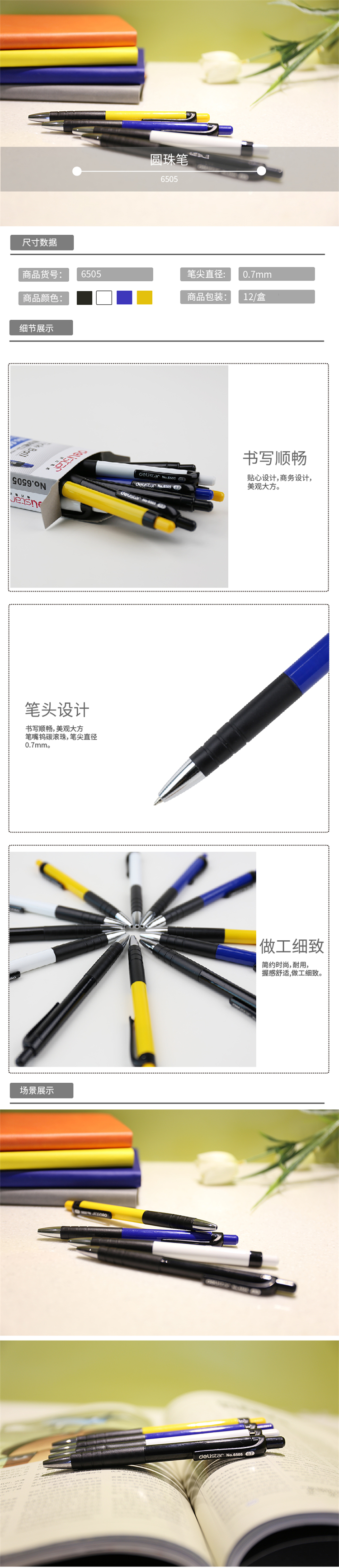 商品标题:得力 6505 0.7mm圆珠笔 12支/盒 (单位:支) 蓝