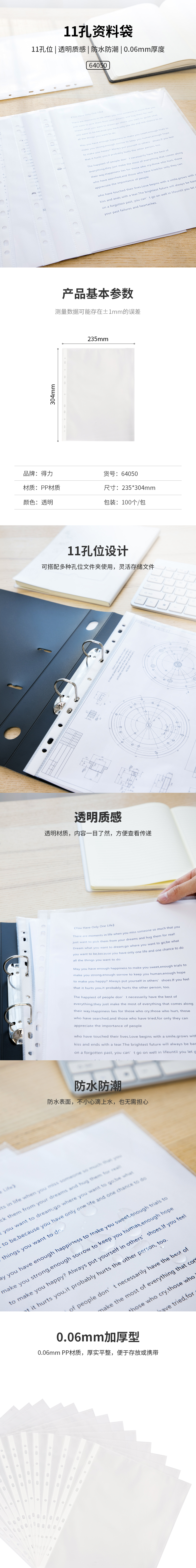 商品标题:得力64050_11孔资料袋(透明)(100个/包)