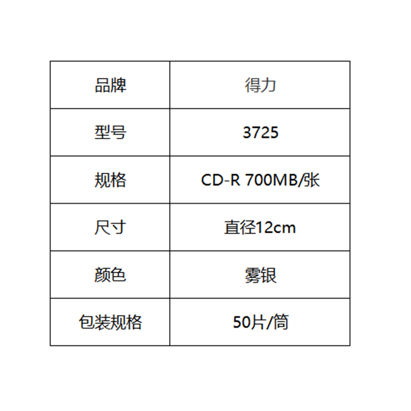 商品标题:得力 3725-CD-R 52X 700MB刻录光盘 50片/筒(筒)雾银