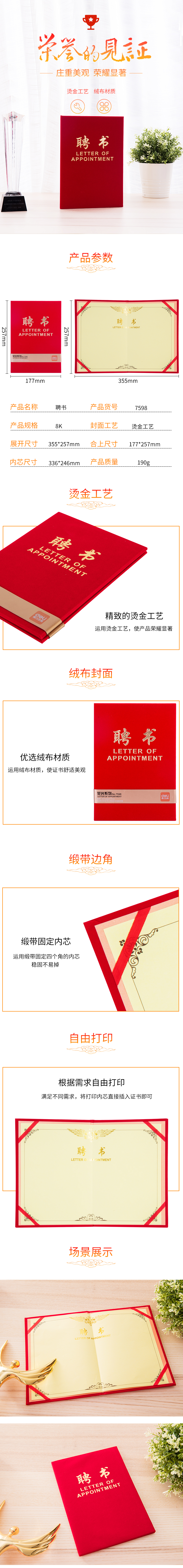 商品标题:得力 7598 聘书 8k/OPP袋装 (单位:本) 红色