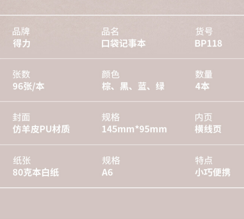 商品标题:得力BP118记事本A6-96张(黑色)(本)