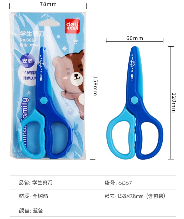 商品标题:得力(deli)6067 120mm儿童塑料剪刀(单位:把)蓝色