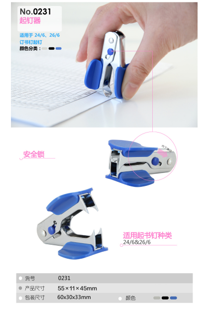 商品标题:得力(deli) 231 55*11*45mm 适配24/6,26/6钉 带安全锁 起钉器 蓝色 (计价单位:台)