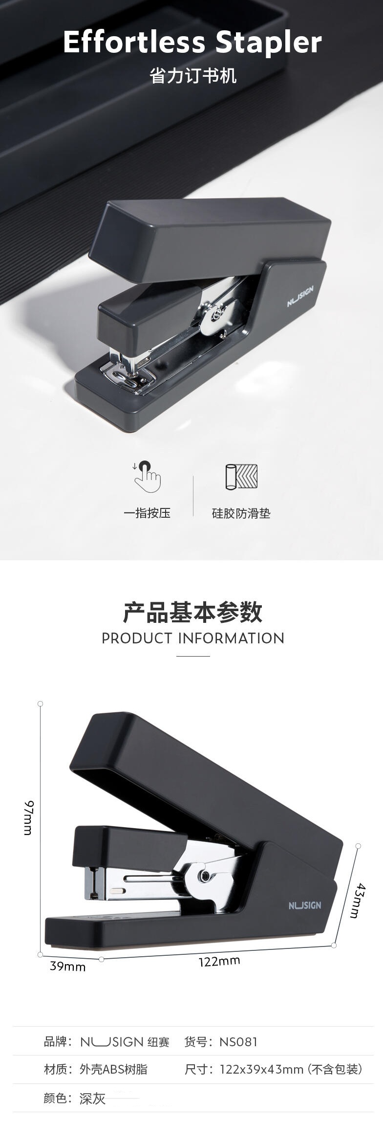 商品标题:纽赛NS081省力订书机(深灰) (单位:台)