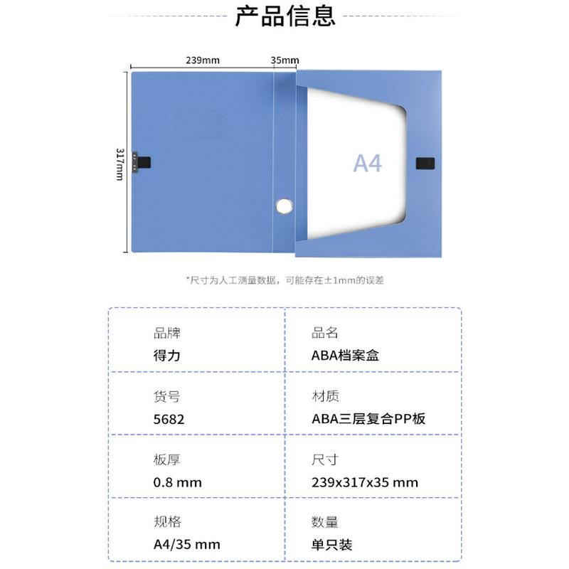 商品标题:得力 5682 PP档案盒236×318×35mm (单位:只) 蓝色粘扣