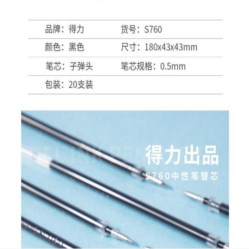 得力 S760 子弹头中性笔芯0.5mm 20支/盒 (单位:支) 黑