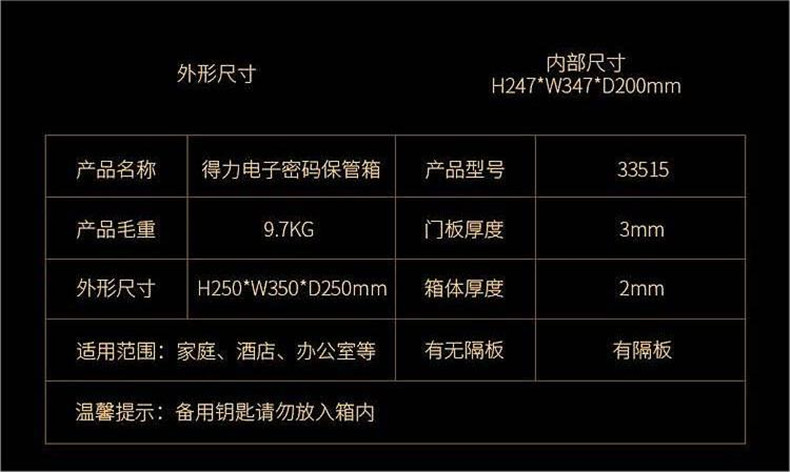 商品标题:得力33515电子密码保管箱H250(黑色)(台)