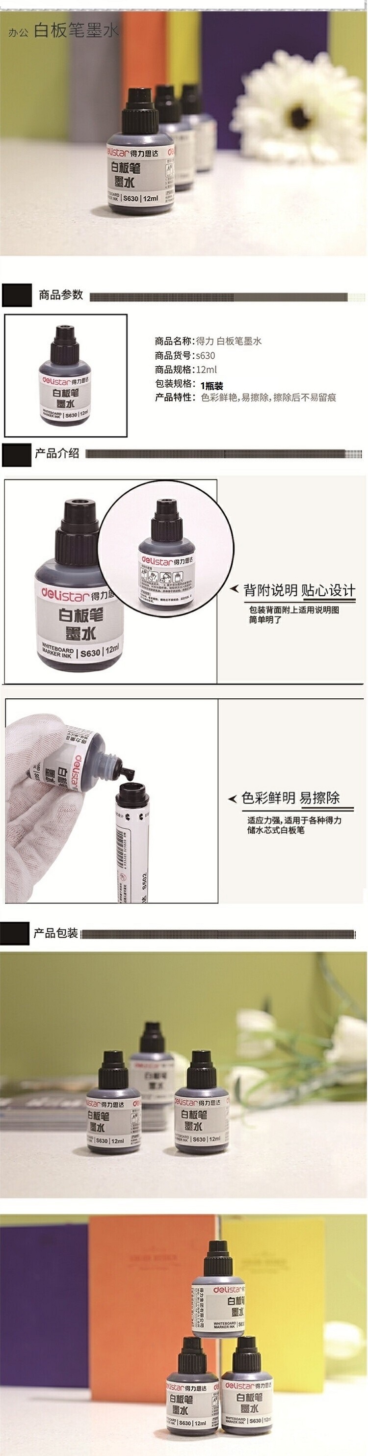 商品标题:得力 (DELI)S630 思达白板笔墨水 12ml 20瓶/盒 黑(单位:瓶)