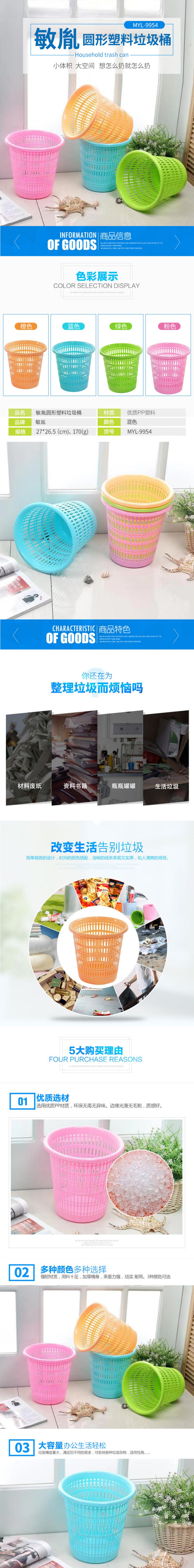 商品标题:敏胤 MYL-9954 家用办公圆形塑料垃圾桶12L 颜色:混色 单位:个