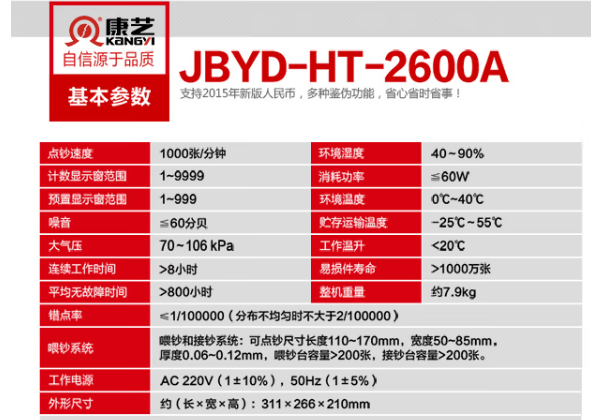 商品标题:康艺 JBYD-HT-2600A(B)新版人民币点钞机办公商用智能验钞机(台)