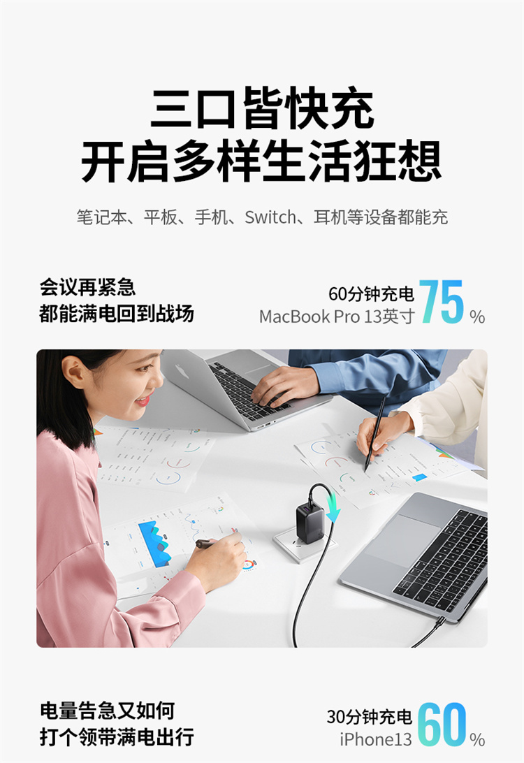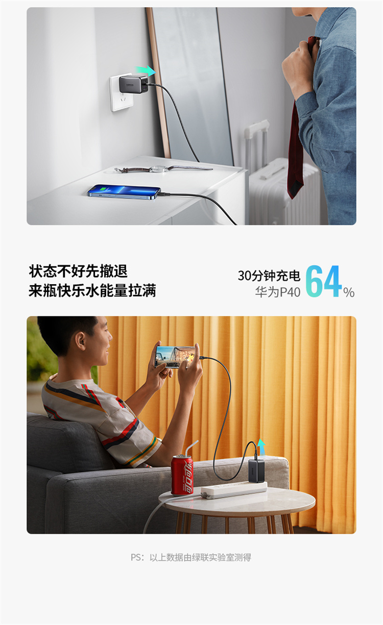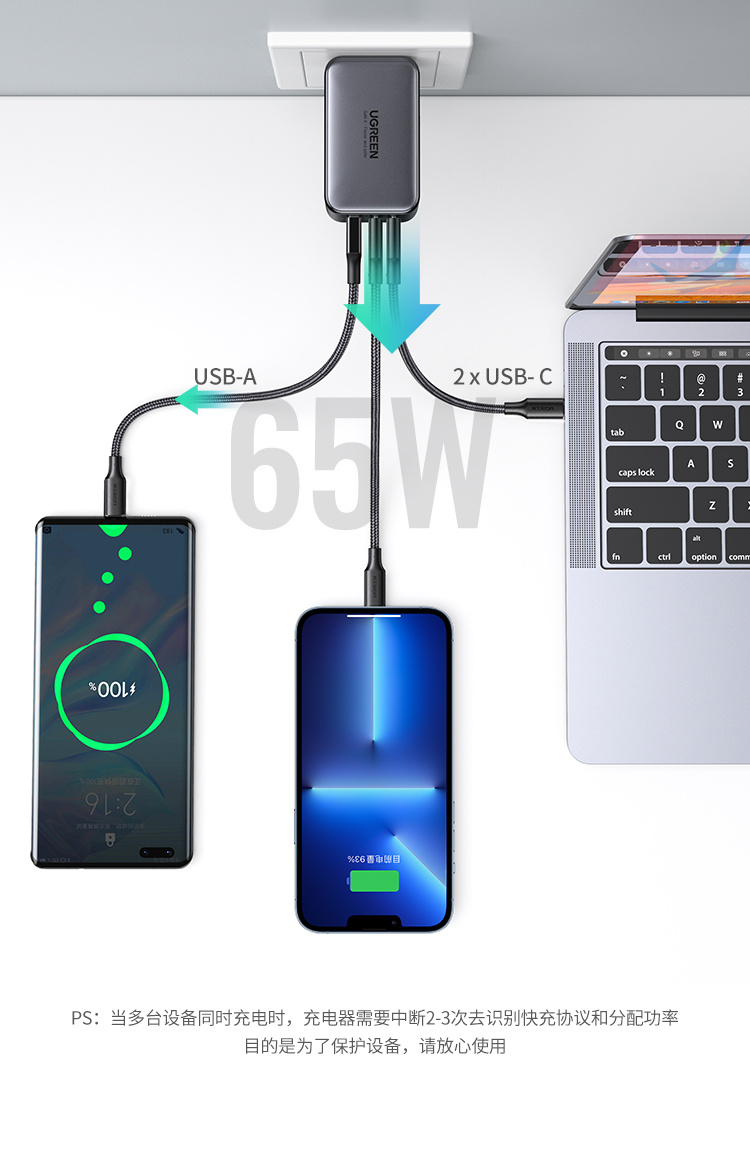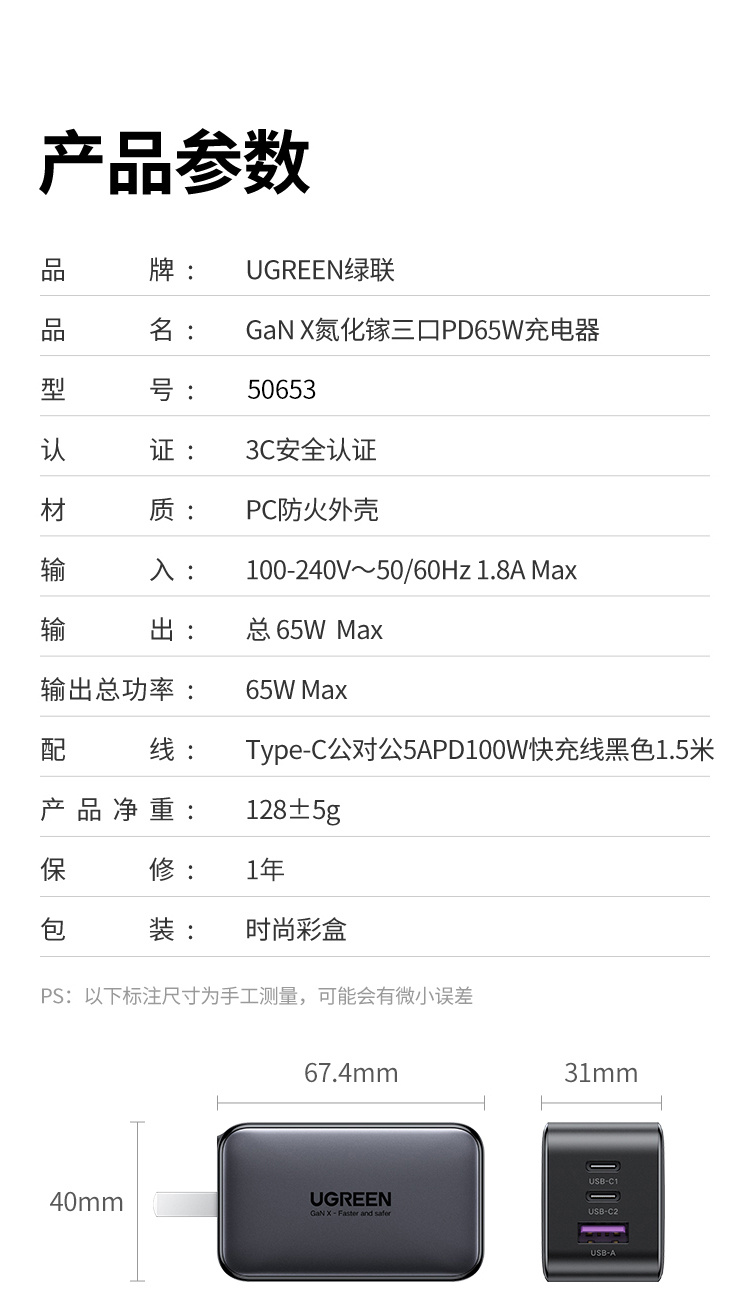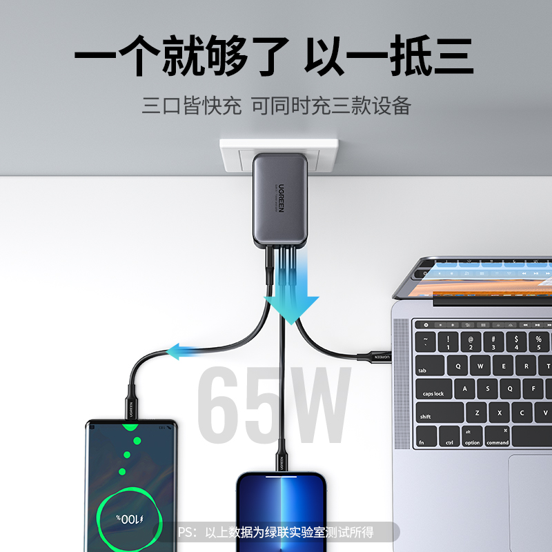 商品标题:绿联50653氮化镓GaN 65W充电器+1.5m100W充电线(套)