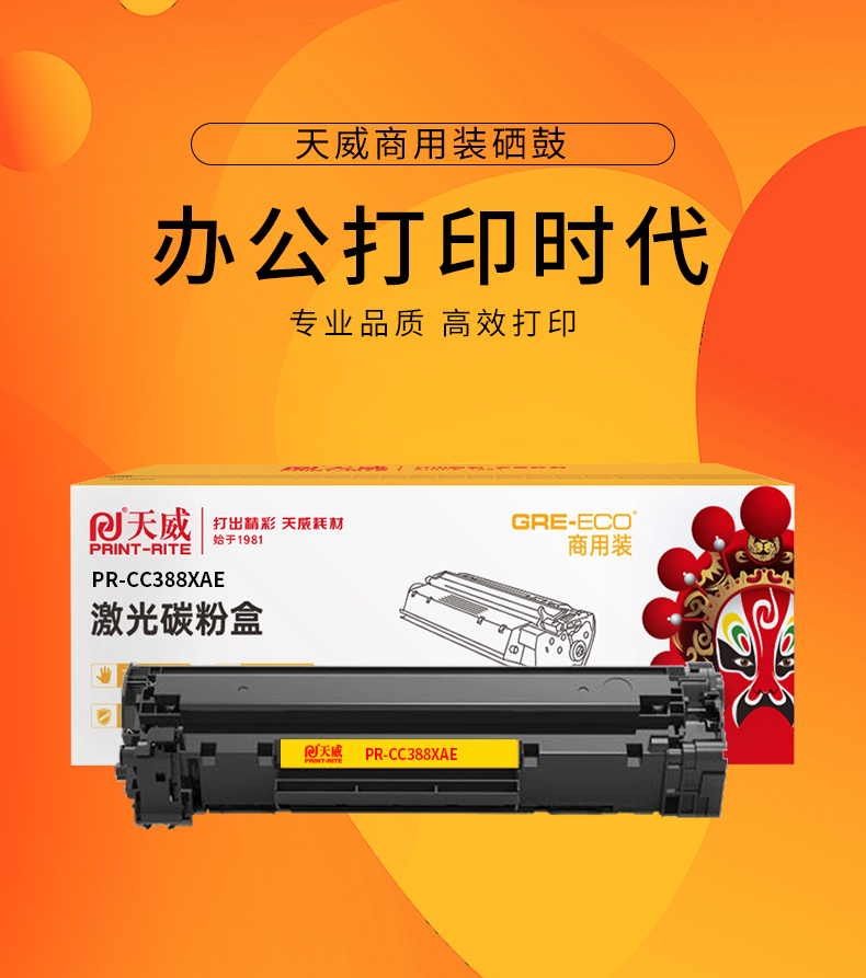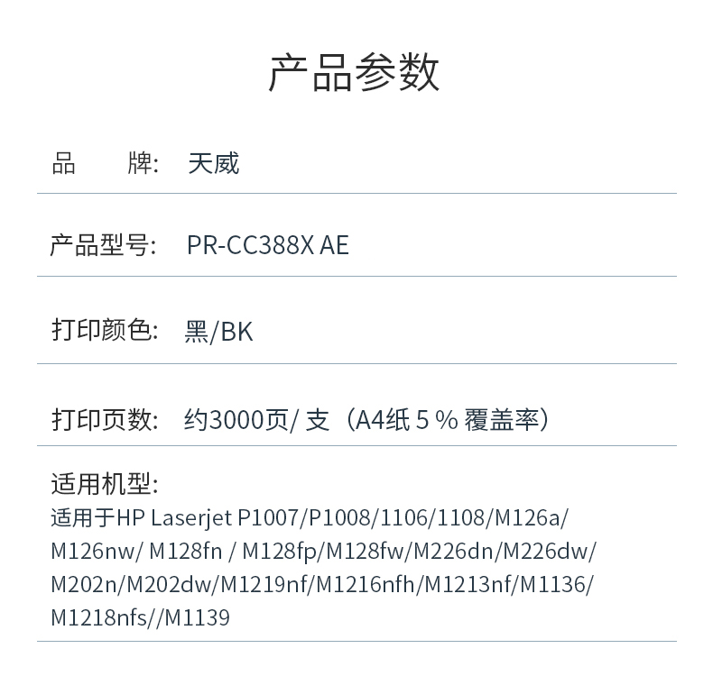 商品标题:天威兼容PR-CC388X AE硒鼓(鼓粉一体)黑色单支装带芯片商用装(适用于HP Laserjet P1007/P1008/1106/1108/)打印页数:3000(单位:支)
