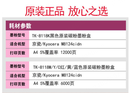 商品标题:京瓷(KYOCERA) TK-8118 黑色12000页,彩色6000页 墨粉 (计价单位:套) 适用于京瓷M8124cidn 黑、红、黄、青四色
