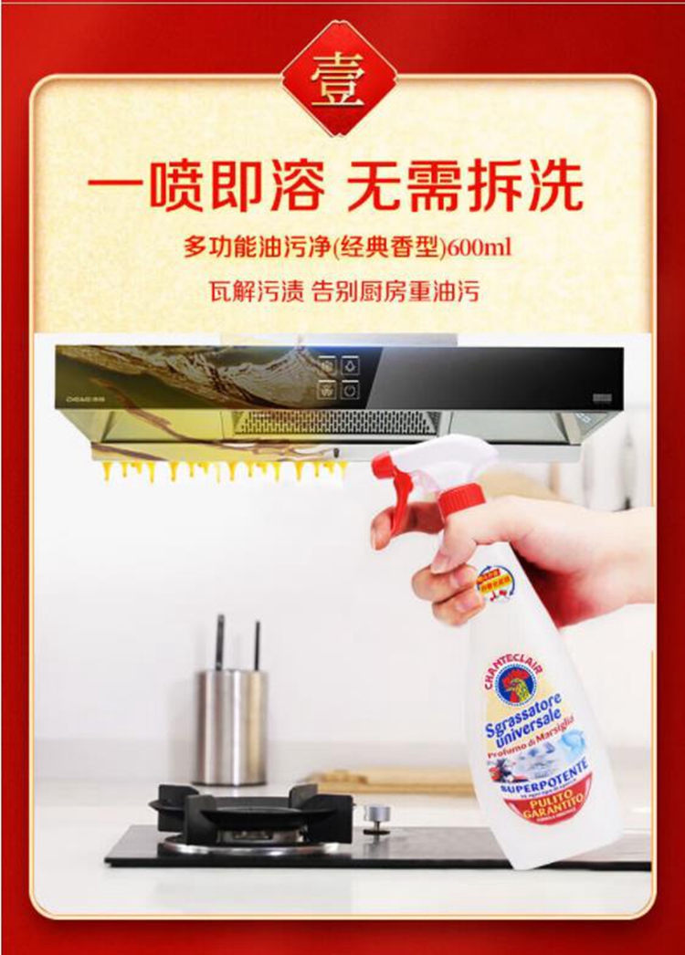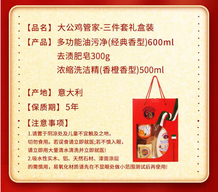 商品标题:大公鸡管家三件套本色(油污净/洗洁精/马赛皂透明洗衣皂)(套)