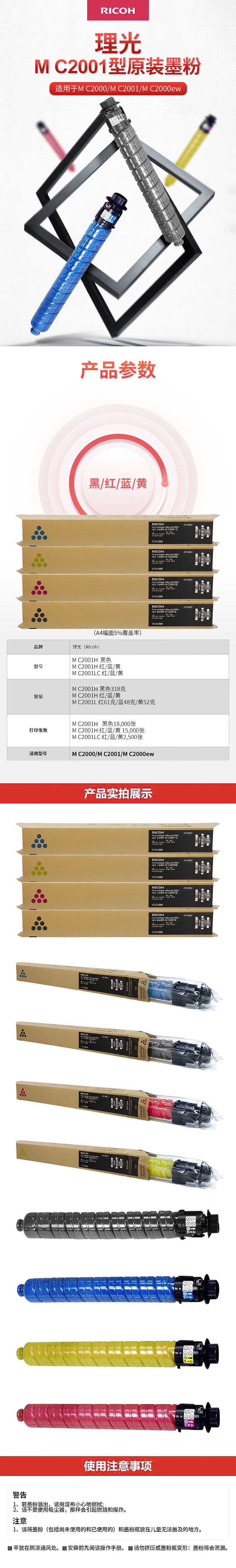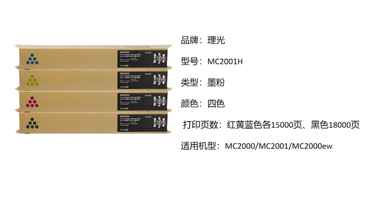 商品标题:理光(Ricoh) MC2001H 打印量红黄蓝色各15000页/支、黑色18000页/支 适用于设备M C2000/M C2001/M C2000ew 碳粉 四色(黑青红黄) (计价单位:套)