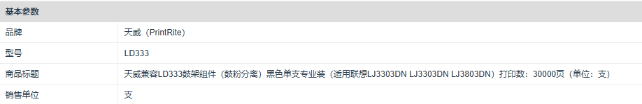 商品标题:天威兼容PR-LEN LD333R鼓组件(鼓粉分离)黑色单支装带芯片专业装(适用于LENOVO LJ3303DN/LJ3803DN)打印页数:30000(单位:支)