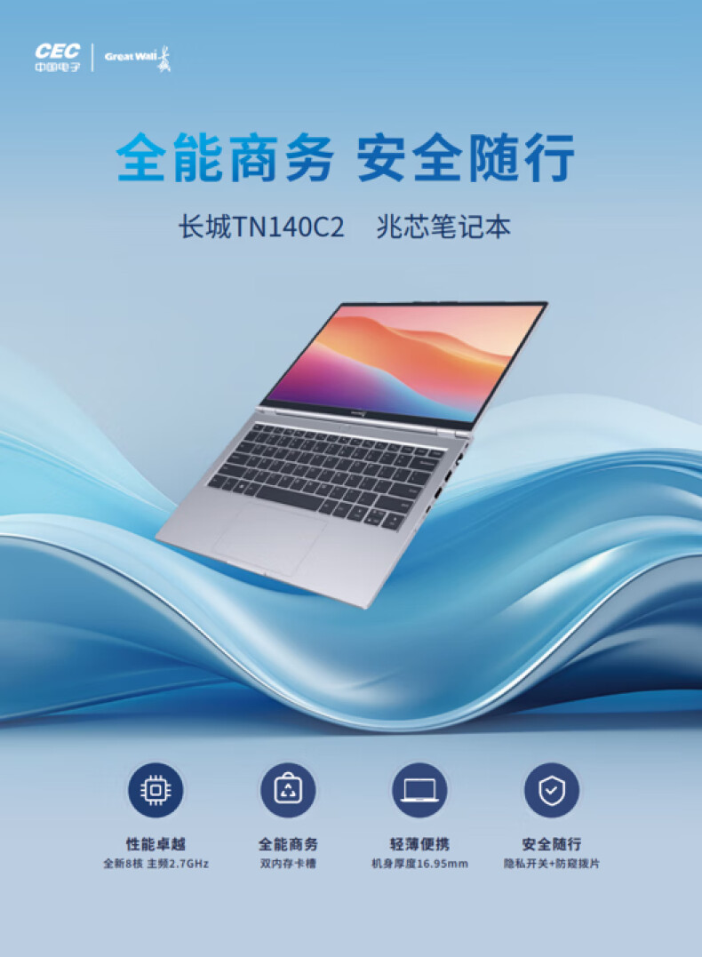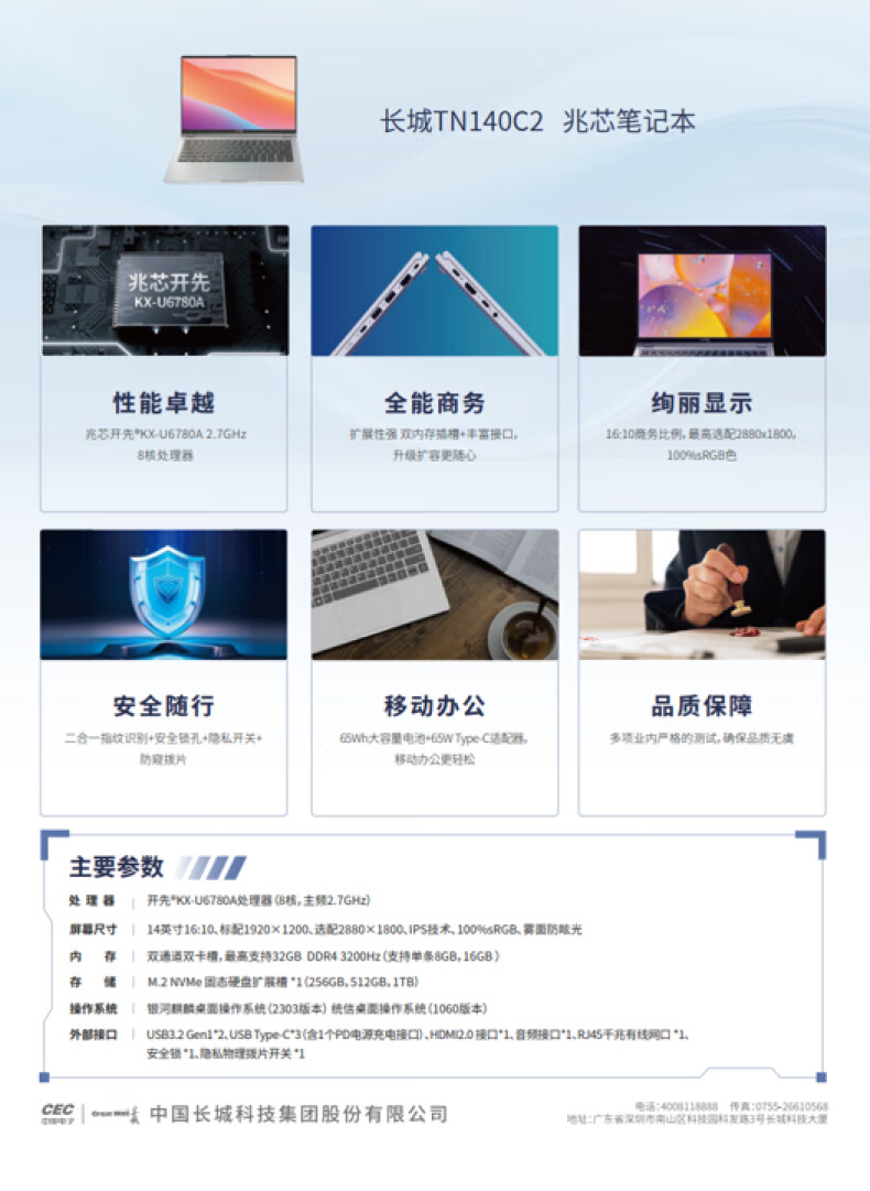 长城 笔记本电脑 TN140C2 兆芯KX-U6780A/16G/1T SSD/集显/14英寸/麒麟桌面系统/无线鼠标/3年(单位:套)