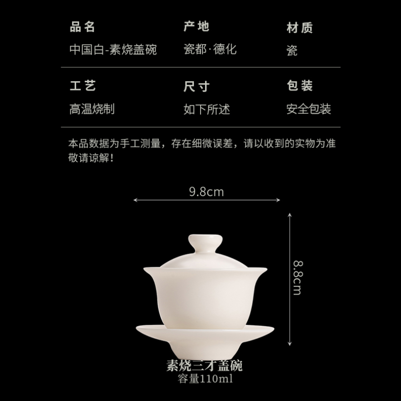 苏氏陶瓷(SUSHI CERAMICS)J0512三才盖碗中国白素烧功夫茶具泡茶碗(单位:个)