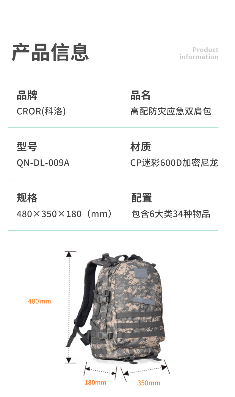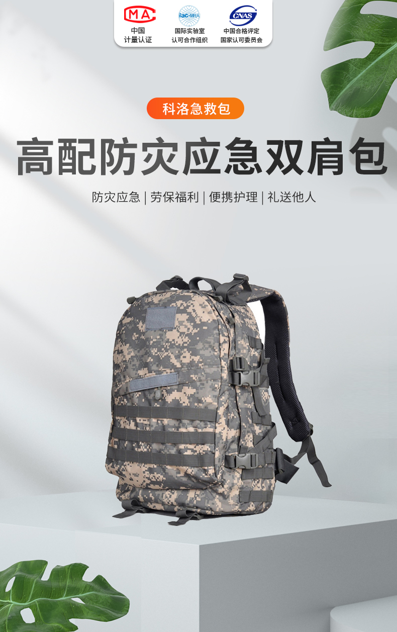 商品标题:科洛(CROR)高配防灾应急双肩包 QN-DL-009A 急救包 迷彩牛津面料 480*350*180mm (单位:套)