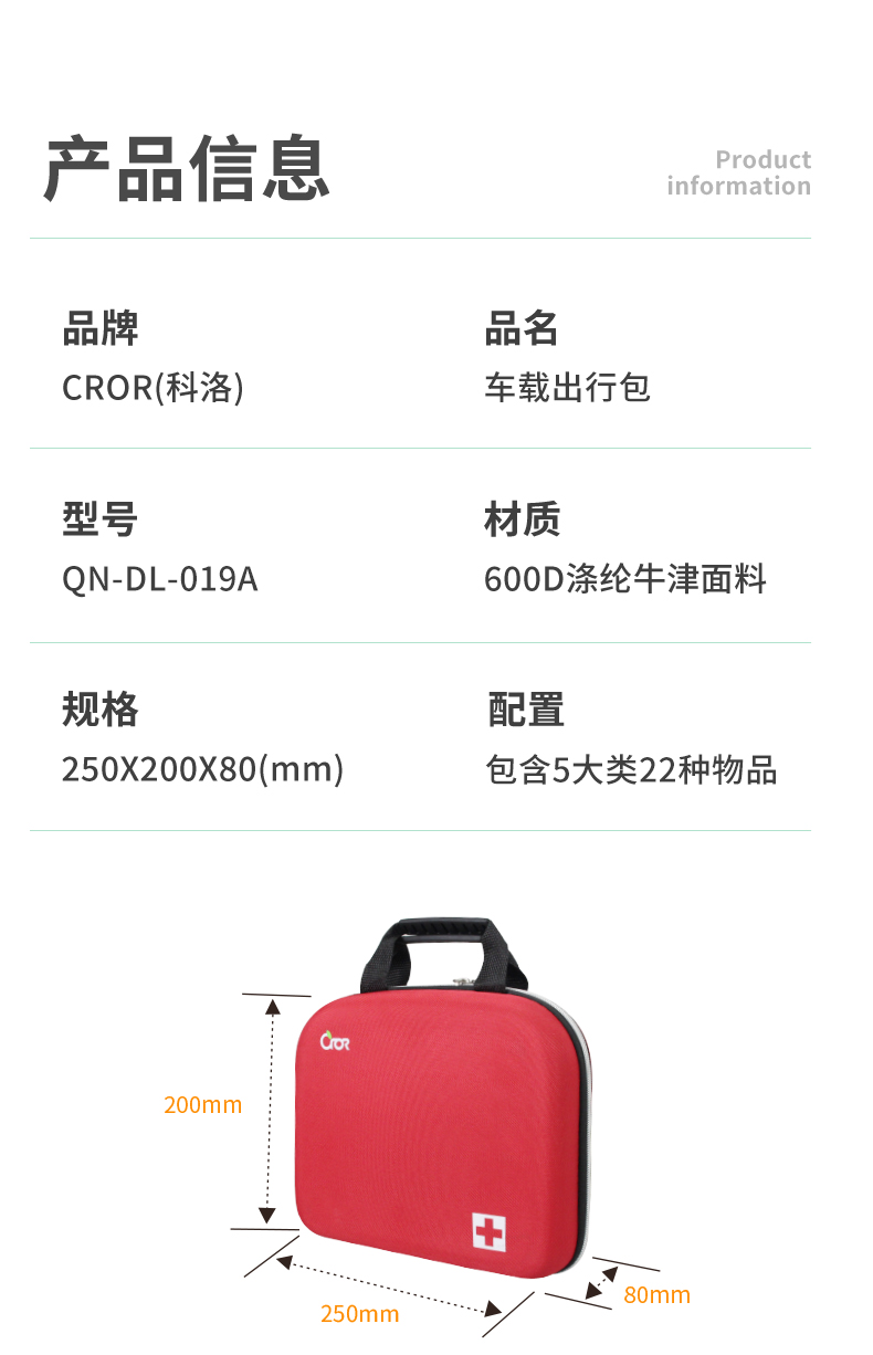 商品标题:科洛(CROR) 车载出行包 QN-DL-019A 急救包 红色 牛津面料 250*200*80mm (单位:套)