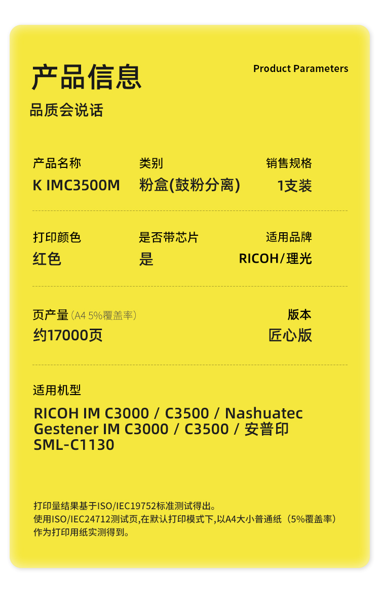 商品标题:科思特(KST)兼容K IMC3500M 匠心版粉盒(鼓粉分离)红色(适用理光C3000/C3500)打印页数:17000页(单位:支)