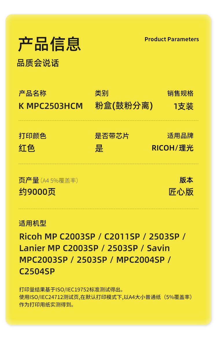 商品标题:科思特(KST)兼容K MPC2503HCM 匠心版大容量粉盒(鼓粉分离)红色(适用理光C2003SP/C2011SP/2503SP)打印页数:9000页(单位:支)