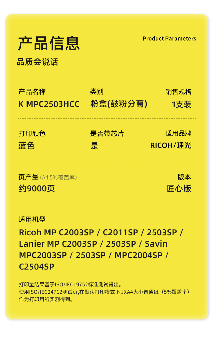 商品标题:科思特(KST)兼容K MPC2503HCC 匠心版大容量粉盒(鼓粉分离)蓝色(适用理光C2003SP/C2011SP/2503SP)打印页数:9000页(单位:支)