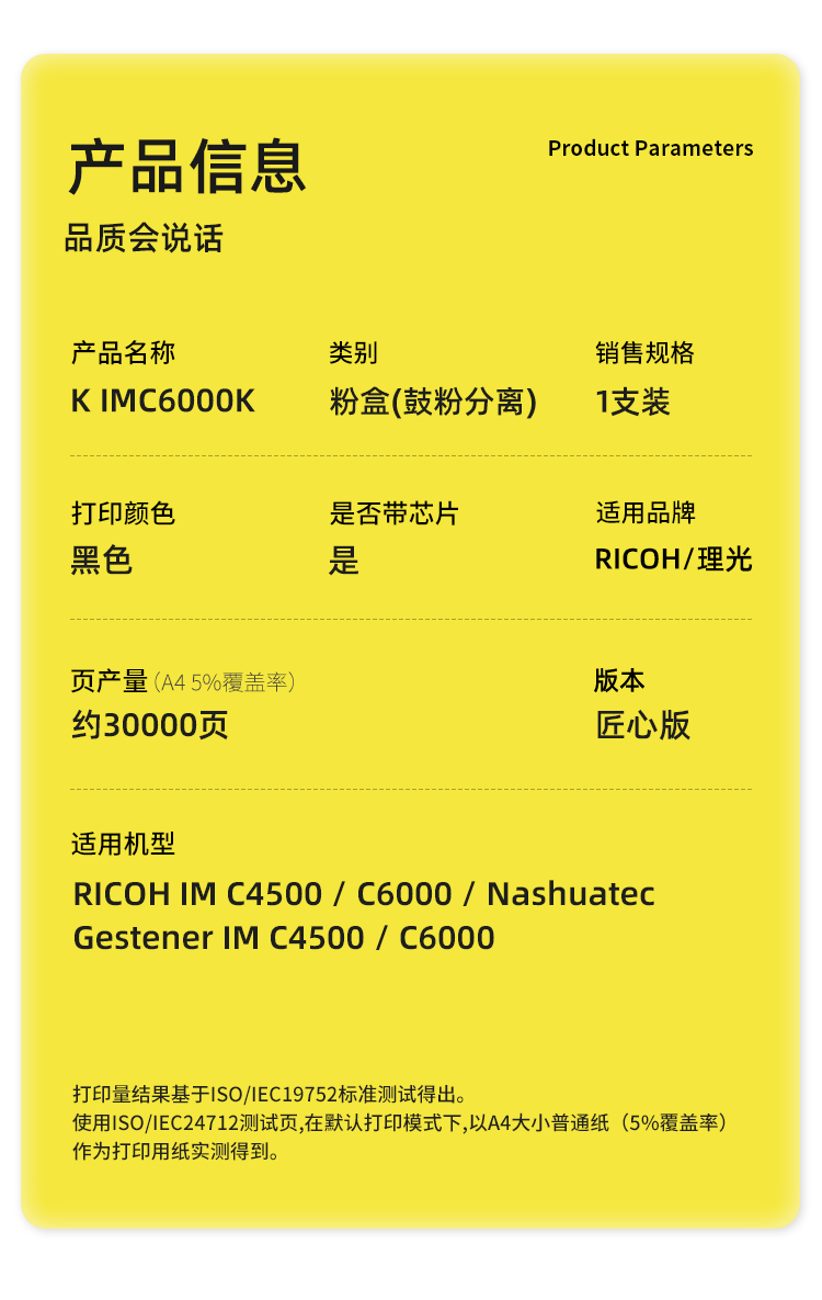 商品标题:科思特(KST)兼容K IMC6000K 匠心版粉盒(鼓粉分离)黑色(适用理光C4500/C6000)打印页数:30000页(单位:支)