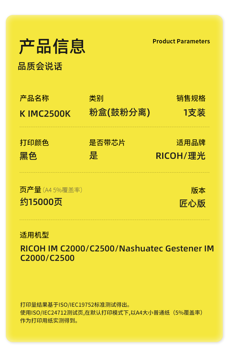 商品标题:科思特(KST)兼容K IMC2500K 匠心版粉盒(鼓粉分离)黑色(适用理光C2000/C2500)打印页数:15000页(单位:支)