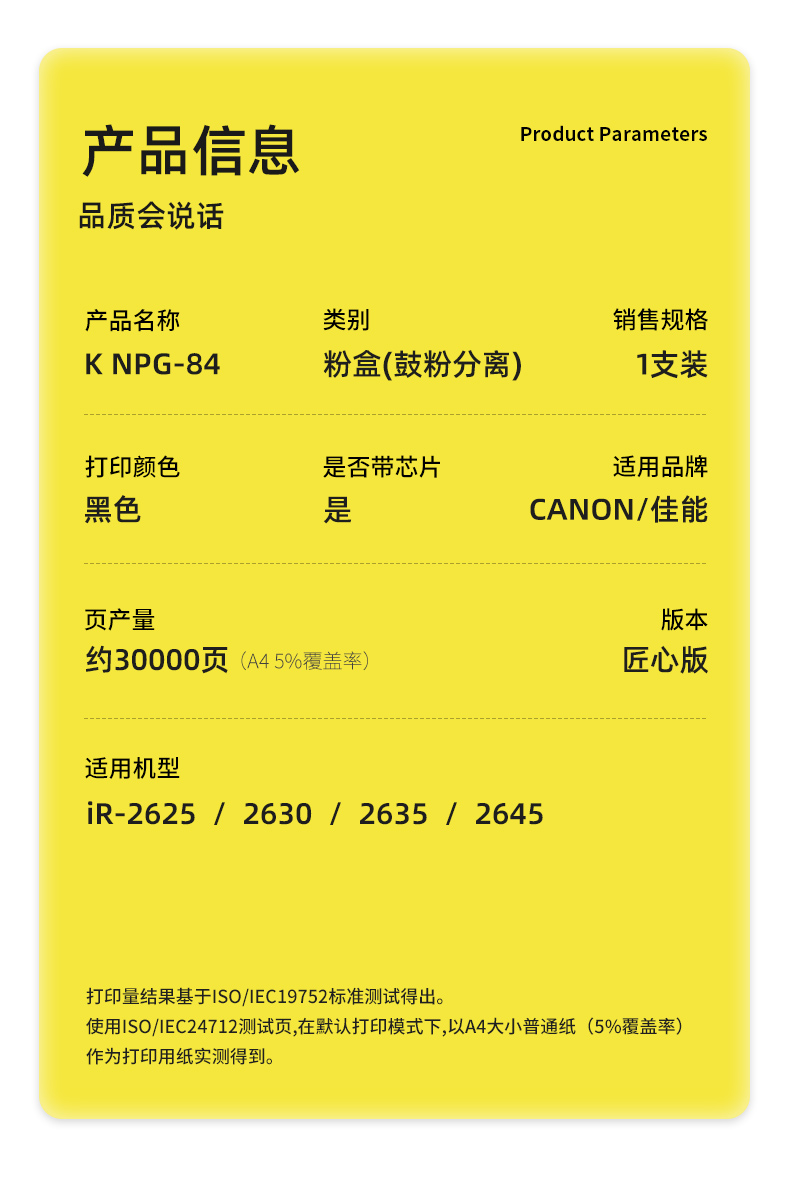 商品标题:科思特(KST)兼容K NPG-84 匠心版粉盒(鼓粉分离)黑色(适用佳能iR-2625/2630/2635/2645)打印页数:30000页(单位:支)