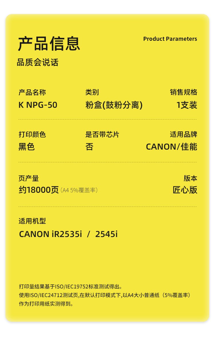 商品标题:科思特(KST)兼容K NPG-50 匠心版粉盒(鼓粉分离)黑色(适用佳能CANON iR2535i/2545i)打印页数:18000页(单位:支)