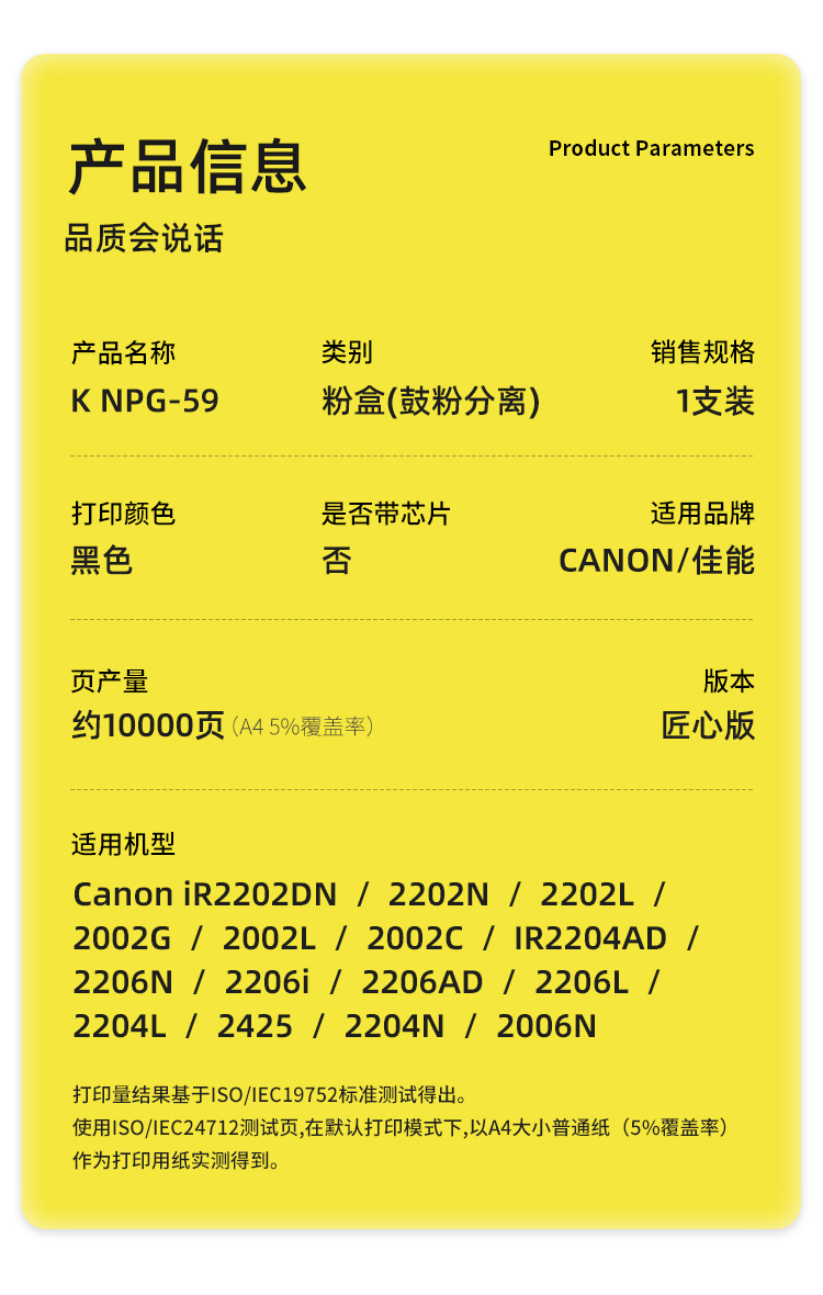 商品标题:科思特(KST)兼容K NPG-59 匠心版粉盒(鼓粉分离)黑色(适用佳能iR2202DN/2202N/2202L/2002G)打印页数:10000页(单位:支)