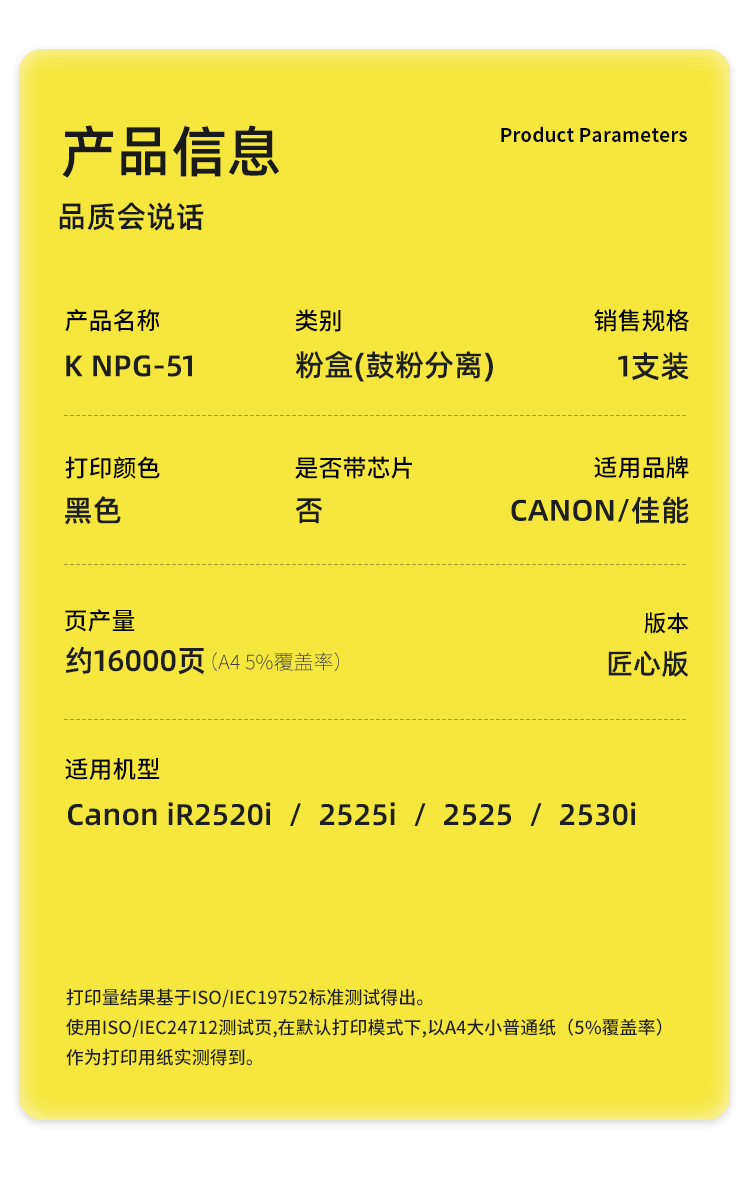 商品标题:科思特(KST)兼容K NPG-51 匠心版粉盒(鼓粉分离)黑色(适用佳能iR2520i/2525i/2525/2530i)打印页数:47000页(单位:支)