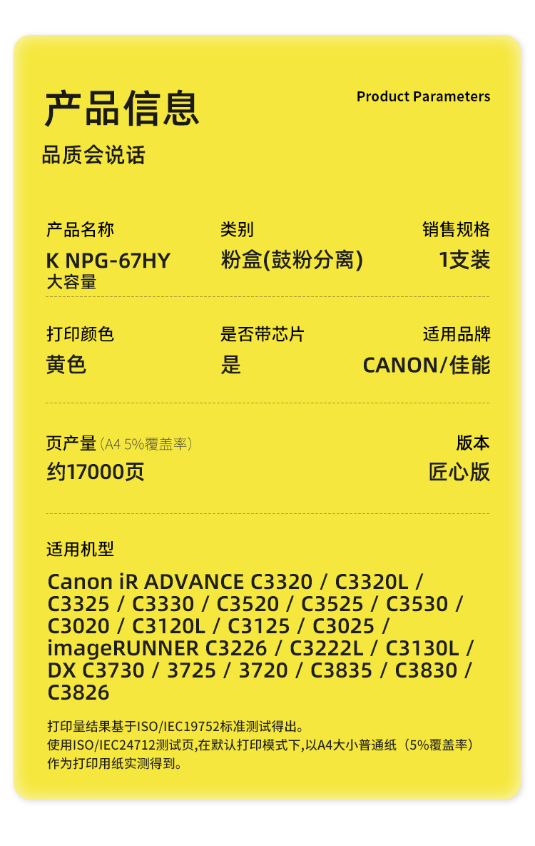 科思特(KST)兼容K NPG-67HY 匠心版大容量粉盒(鼓粉分离)黄色(适用佳能Canon iR ADVANCE C3320/C3320L/C3325/C3330)打印页数:17000页(单位:支)