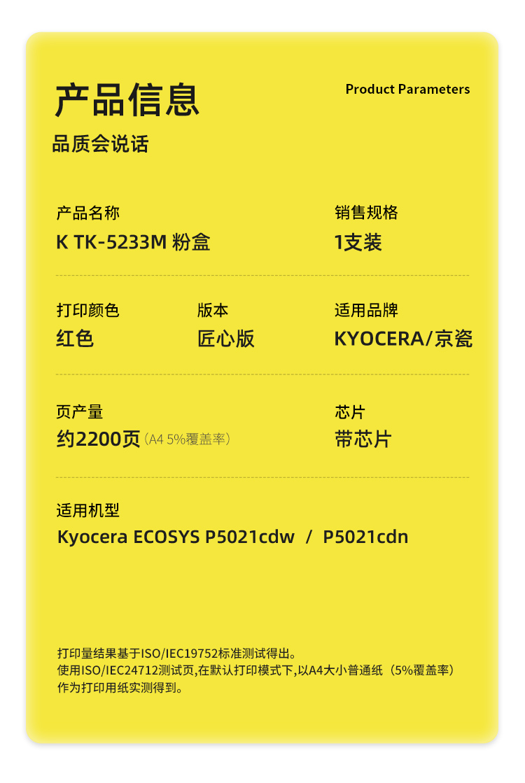 商品标题:科思特(KST)兼容K TK-5233M 匠心版粉盒(鼓粉分离)红色(适用京瓷Kyocera Ecosys P5021cdw/P5021cdn)打印页数:2200页(单位:支)
