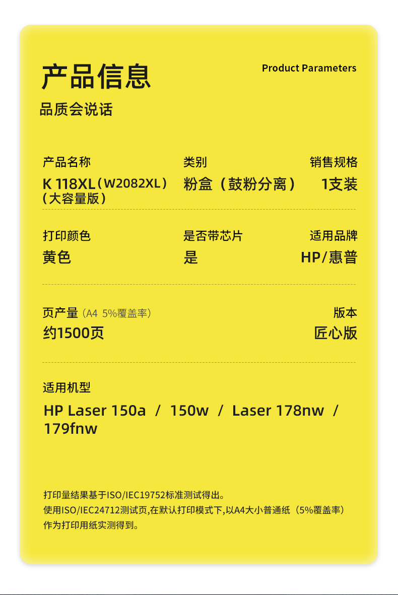 商品标题:科思特(KST)兼容K 118XL(W2082XL)匠心版大容量粉盒(鼓粉分离)黄色(适用惠普150a/150w/178nw/179fnw)打印页数:1500页(单位:支)